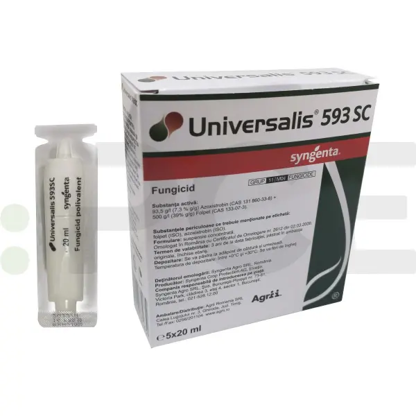 Universalis 593 SC are ac_iune sistemic_ local_ (translaminar_ n frunze) _i de contact. Universalis interfereaz_ n ciclul de via__ al agen_ilor patogeni, n principal n timpul germina_iei sporilor, prin inhibarea mobilit__ii _i germina_iei zoosporilor (reduce riscul infec_iilor secundare). Azoxistrobin este preluat gradual n frunze, n timp ce folpetul r_mne la suprafa_a frunzelor.